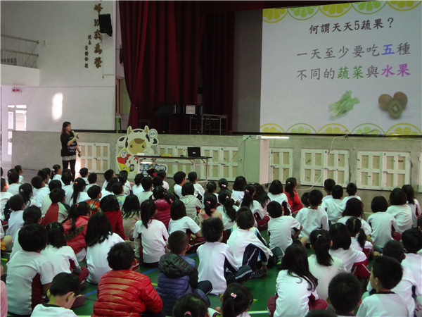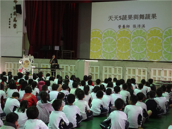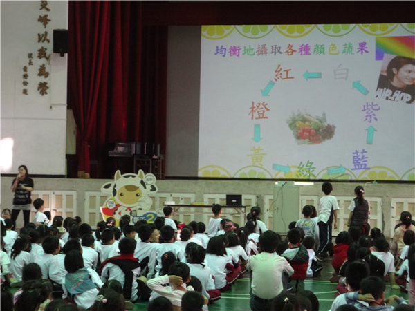 103學年度本校配合台灣癌症基金會於本日(12/01)辦理低年級蔬果營養教育宣導活動,教導小朋友何謂天天5蔬果(蔬果彩虹579)、吃蔬果的好處、份量的概念及彩虹攝食原則,並且以強身動感的蔬果操帶領小朋友愛上蔬果,漸而培養健康飲食的自主權。