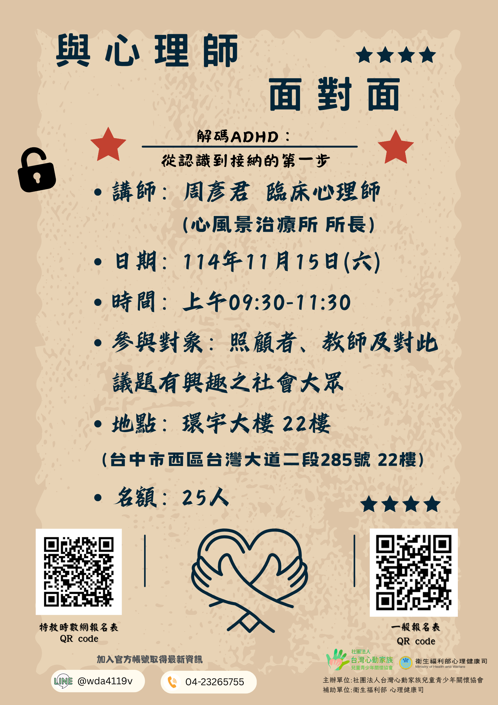 函轉社團法人台灣心動家族兒童青少年關懷協會辦理「114年11月 ADHD 相關主題講座及心理師面對面活動」,請查照。